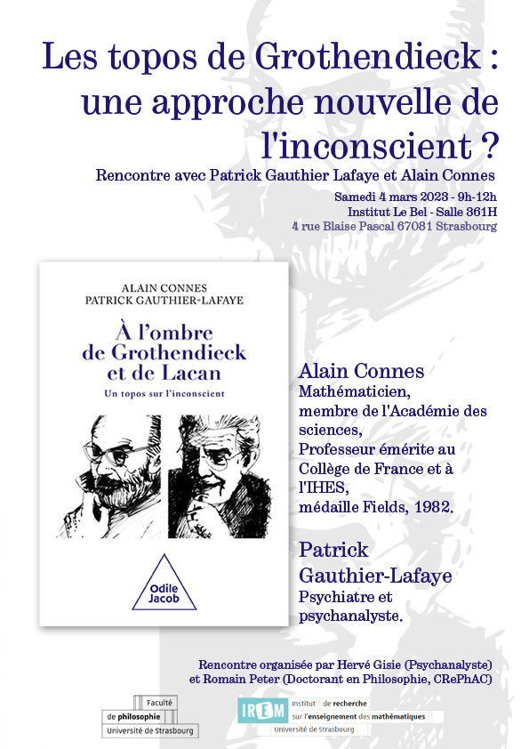 Catégorie: Psychanalyse Étiquettes : Alain Connes, Faculté de Philosophie Université de Strasbourg, Hervé Gisie, IREM Univ. Strasbourg, Jacques Lacan, Mathématiques, Patrick Gauthier-Lafaye, Romain Peter